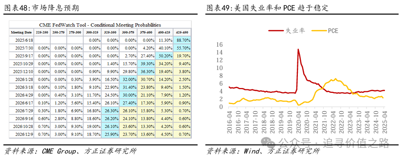 央行对黄金的购买可能与通胀风险和逆全球化进程有关,央行对黄金的战略性购买需求可能在长期内保持稳定。投资者对黄金的超配同样可能会发生较大的变化,需要重点关注美国和全球的经济形势。从短期来看,我们需要重点关注黄金的避险属性,考虑包括地缘政治和关税战等诸多风险点对黄金需求的短期冲击,即全球风险边际缓解,可能引发黄金避险需求的降低,而全球风险的进一步发酵,可能推高黄金的避险需求。从长期来看,黄金的金融属性和货币属性对黄金的价格影响可能更为显著,我们需要关注美联储可能的降息及美国的通货膨胀率,还需要关注特朗普政策对美国“滞胀”风险和美元国际地位的影响。