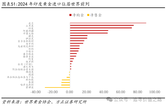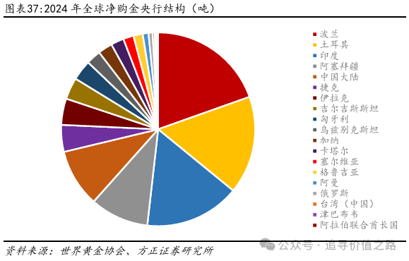 近年来黄金价格持续上涨,央行的购金需求成为金价上涨的重要支撑。随着美国推动逆全球化进程不断加速,央行对黄金的购买逐渐提高。一方面,2022年爆发的俄乌冲突,以及2023年爆发的加沙战争、红海危机等,显著提高了全球地缘政治风险;而在另一方面,拜登政府不断推进的“小院高墙”和科技制裁,以及此后特朗普政府的“关税战”,无疑进一步加剧了逆全球化问题。在这种背景下,各国央行开始显著提高对黄金的购买,并成为了推动黄金价格上涨的重要因素。其中,前五大净购金国分别为波兰、土耳其、印度、阿塞拜疆和中国大陆,前五大净购金国总计贡献了71%的净购金总额。