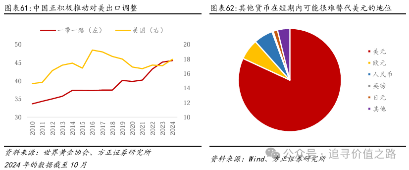 此外,美元体系的武器化是央行增持黄金的重要原因。其中2022年俄罗斯部分银行被排除出SWIFT系统,和俄罗斯央行在海外的外汇储备被西方冻结,是全球央行加大对黄金购买的标志性事件。在美欧宣布对俄罗斯的多项制裁后,俄罗斯被迫放弃对美元的使用,并扩大了对黄金的购买。而其他国家出于对美元信用和外汇储备安全性的疑虑,一方面会减少对美元的使用,另一方面会提高对黄金的购买需求。而除了美元和国际支付系统的武器化,2025年美国总统特朗普发起的新一轮关税大战,引发各国对美元信用和地缘政治风险的进一步担忧,是黄金价格上涨的又一大推手。由于美国逆全球化进程的长期性,全球央行对黄金需求可能会长期处于高位,进而在中长期层面支撑黄金价格的持续上涨。