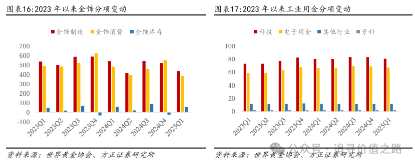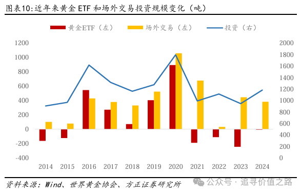 黄金的ETF和场外交易需求波动较大,黄金的投资需求波动显著。黄金的ETF需求和场外交易需求等变动较大,反映投资者对黄金投资需求的整体变动和对不同投资方式的偏好。从结构上看,黄金的ETF投资需求变动更大,在2019-2020年表现为较大的正值,但在2021-2024年始终保持为负,而从近几个季度来看,黄金的ETF需求有转向正值的态势。而从黄金的场外交易来看,黄金的场外交易始终保持为正,且变动相对ETF更小,在2021年以来有减小的态势。而从黄金的整体投资需求来看,黄金的投资需求在2021年来相对减小,但2024年开始有回升态势。