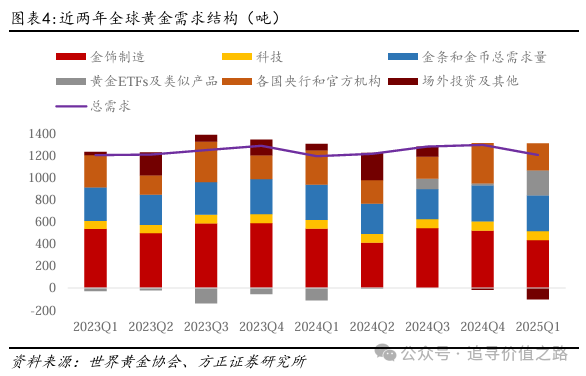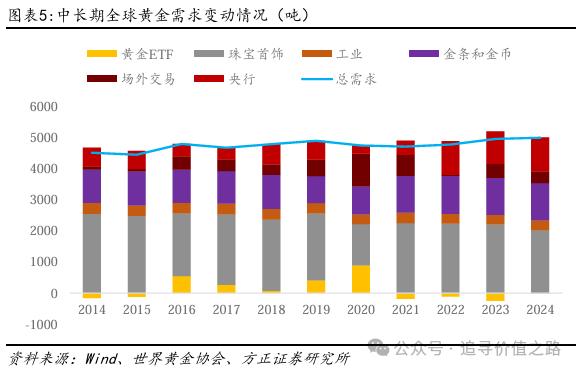 黄金的需求端中,近年来央行和官方机构的购金需求逐步提高。黄金的需求可分为金饰制造、工业用金、金条和金币用金、央行购金和黄金ETF及场外投资等。其中央行的黄金购买额在近几年出现较大幅度的增加,成为影响黄金价格的重要因素。从2022年开始,央行购金量有了显著的提高,截至2024年底,各国央行和官方机构的需求占当年总需求的21.77%,成为影响黄金价格的重要因素。另外,央行的积极购金行为还可能引发投资者的跟随。