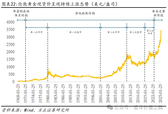 根据1968-2025年的伦敦黄金现货价,我们可以将黄金的价格走势大致分为三个区间,分别以1971年8月15日和2022年2月24日为分界点,体现在图中最上方第一行所标示的三个阶段。其中第一阶段和第二阶段的临界点是尼克松发表电视讲话关闭“黄金窗口”的时间,标志着布雷顿森林体系的崩溃;而第二阶段和第三阶段的临界点是俄乌冲突爆发后,美国宣布冻结俄罗斯在美所有资产的时间,引发了各国央行对美元资产的不信任。这两个时间点划分出三个时期,分别为“布雷顿森林体系”时期、传统框架时期和黄金走势新阶段。
