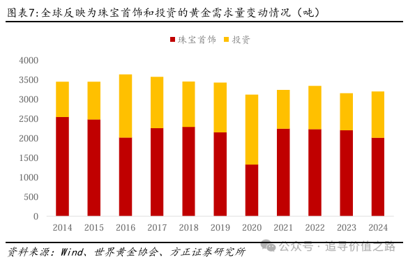 从全球黄金供需表中供给端来看,近年来黄金的供给端保持小幅度上涨。黄金的储量相对有限,且黄金的生产经营周期一般相对很长,从发现、开采到冶炼加工通常需要数年的时间。因此,金矿的生产经营一般很少对短期黄金价格变动做出反应。