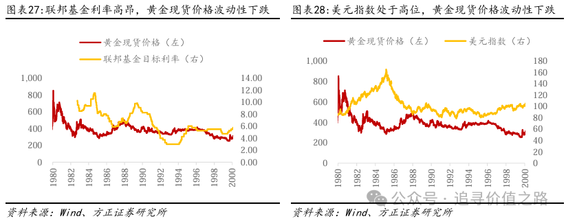 1981-1999年,美联储的加息、美国经济的复苏和美元的升值是黄金价格下跌的主要因素。美联储主席沃尔克的暴力加息,降低了美国的通胀水平,提高了美国的实际利率水平,支持了美元的币值;而80年代个人电脑的普及和信息革命的发展,提高了经济的增长率,并通过利率的顺周期性提高了名义利率和实际利率水平。因此,在这段时期内,美国的经济环境支持了美元的价值,提高了实际利率水平,并进而降低了黄金的需求。此外,“广场协议”下美元指数的上涨,也是抑制黄金价格增长的重要因素。