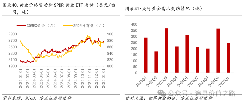 2024年黄金价格呈现不断上涨态势,黄金的两次主要涨幅的驱动结构很可能不同。黄金在2024年有两次较大的涨幅,分别在3月-4月中旬和7月-10月中旬。其中后一次黄金价格的波动和SPDR黄金ETF的持有量变动高度相关,而前一次黄金价格的波动与SPDR黄金ETF的持有量变动相关性不大,有可能来自于央行2024年1季度较高的黄金需求。