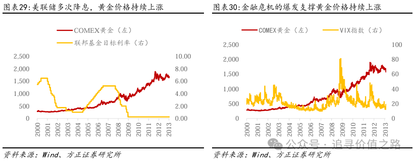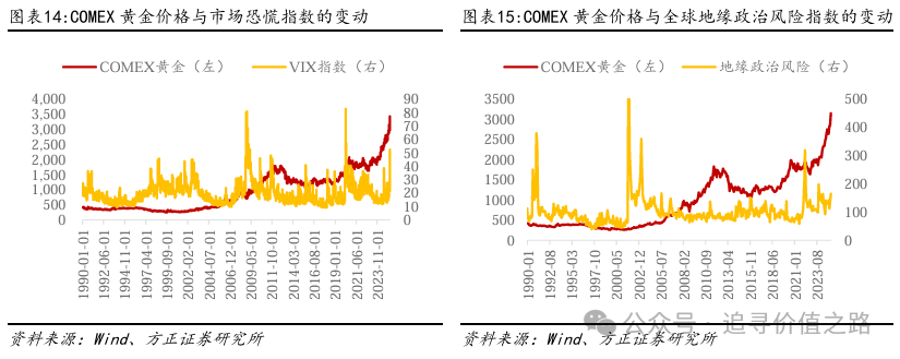 黄金可以视为无风险资产,因此在面对政策不确定性或者经济危机时,投资者会超配黄金作为避险手段。黄金具有稀缺性,且其价值超越国界和意识形态,被人类普遍接受。因此,当市场出现较大动荡表现时,投资者往往会投资黄金作为避险资产。当投资者面对的市场风险扩大时,黄金的价格往往会有抬升的态势。市场风险烈度越大,持续时间越长,不确定性越高,黄金上涨的幅度和持续时间往往就越大。这一点可以通过投资者恐慌指数VIX进行度量。VIX是衡量标准普尔500指数期权波动率的指标,该指标越大,表现投资者对未来风险的预期越悲观,此时黄金的价格往往会出现上涨。
