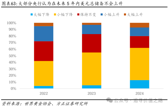央行对美元信任度下降,黄金成为替代的“过渡”货币。而从另一个角度来看,央行对美元的信任程度正不断下降,美元在全球外汇储备中的占比呈下降趋势。而美元占比的下降难以通过欧元和人民币等其他货币进行补充,欧元和人民币在全球外汇储备中的占比并没有得到显著的提高。因此,在新国际货币接替美元地位之前,黄金可以作为替代美元的“过渡”货币,在国际支付中发挥积极作用,因此黄金在外汇储备中的地位仍然较高,从长期来看,央行对黄金的增持行为可能将得到延续。