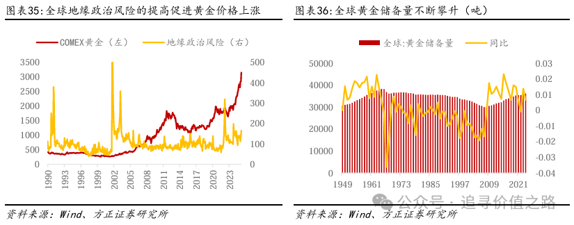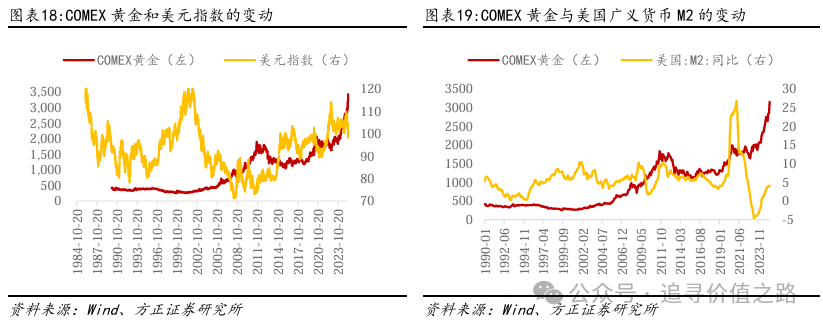 从数据上看,COMEX黄金价格与美元指数呈现一定的负相关关系,但黄金价格与美元指数的负相关关系相对有限,且在长期看更加具有解释力;而黄金价格与美国广义货币M2之间的相关关系,则相对更加模糊,从理论上来看,黄金价格与美国M2应该呈现负相关关系,但这种负相关关系在2021年-2023年表现较为清晰,但在2011-2019年以及2023年下半年后,这种相关关系表现为正相关。