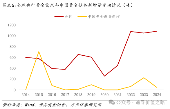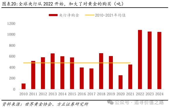 全球央行对黄金的净购买,是2022年后黄金价格上涨的重要影响因素。从数据来看,2010-2021年,全球央行净购金平均值仅为481.36吨,而2022年央行净购金达到了1080吨,此后2022-2024年全球央行净购金平均值达到了1058.48吨。