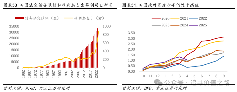 美国政府面临债务偿还压力,其偿债信用可能会影响美元的国际地位。美联储自2024年12月降息以来,联邦基金目标利率始终维持在4.25%-4.5%之间。高昂的利率环境会推高美国政府偿债压力,尤其是近期到期并新发行债务的利息负担,进而影响到美元的信用。从美国国债数据来看,美国债务法定限额和财政利息净支出均达到历史新高,美国债务偿还能力在当前利息环境下具有一定的不确定性。