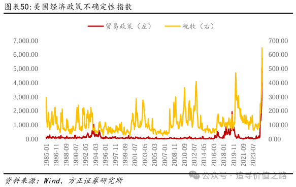 美国经济政策具有很大的不确定性,市场避险情绪有所上升。美国特朗普自上台以来,经济政策朝令夕改,美国的经济政策不确定性指数在近期陡增,体现了市场对美国政策风险的担忧。而特朗普的关税政策的不确定性,是近期市场对黄金避险需求上升的重要原因。需要注意的是,这部分避险需求会因为特朗普关税政策的边际缓和,而有所下降。