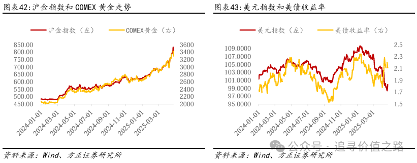 我们认为黄金的价格在短期内可能发生回调,但从长期来看,当前黄金的价格在阶段性回调后有望维持长期上涨趋势。当前黄金价格本身已经处于较高位,同时近期随着贸易战等外部事件暂缓,短期内可能引发部分投资者高位获利了解或央行放缓黄金购买节奏,进而引发黄金价格的出现阶段性回调。但从中长期角度看,我们认为在美元信用下降、美联储降息周期开启、全球央行持续增加购金的背景下,黄金在短期调整后有望继续维持长期上行趋势。
