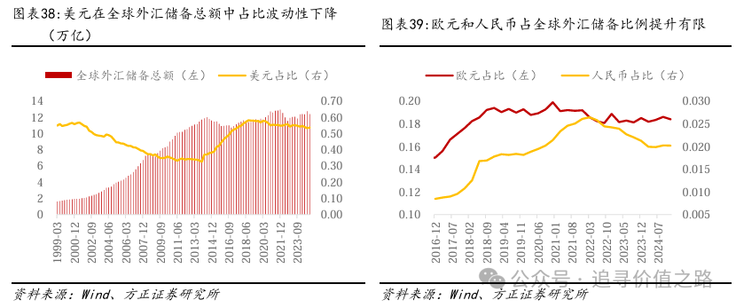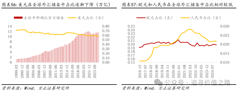 央行对美元的信任度有所下降,黄金在外汇中的作用难以替代。前文已经提高,全球央行在2022年开始,大幅提高对黄金的购买需求,是推动黄金价格不断上涨的重要原因。而从另一个角度来看,央行对美元的信任程度正不断下降,美元在全球外汇储备中的占比呈下降趋势。而美元占比的下降难以通过欧元和人民币等其他货币进行补充,欧元和人民币在全球外汇储备中的占比并没有得到显著的提高。因此,在新国际货币接替美元地位之前,黄金在外汇储备中的地位仍然较高,在长期来看央行的增持行为可能将得到延续。