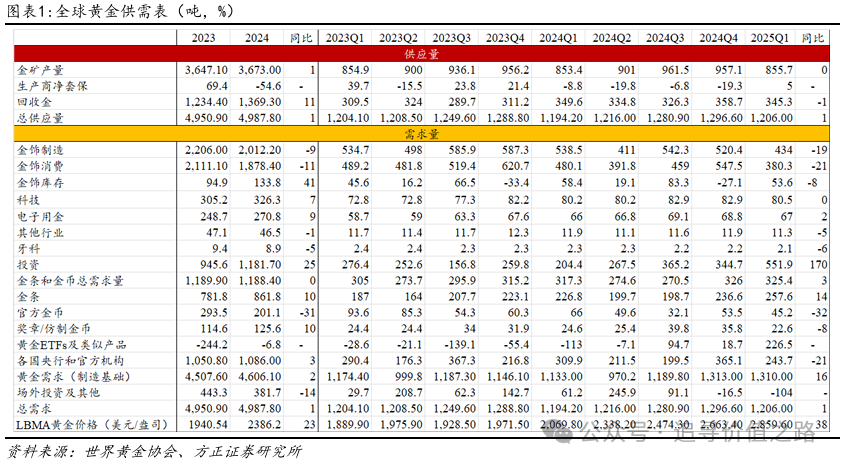 今年一季度黄金价格表现强势,呈快速上涨态势。截至4月21日,黄金现货价创下历史新高,达到3425.30美元/盎司,而近期黄金现货也创下历史新高。黄金的此次上涨很可能是源于美国总统特朗普发动的关税战进程,该关税战幅度为近几十年来的历史高点,范围也超出了市场预期。而特朗普承诺将迅速解决的俄乌冲突仍摩擦不断,加沙地区的紧张局势也并未得到缓解。在地缘政治动荡、美国逆全球化进程大幅加快的情况下,黄金的避险需求成为黄金价格变动的重要影响因素。而在对黄金的购买需求中,央行的购金需求仍然是主要的影响因素。