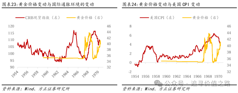布雷顿森林体系末期,国际通胀和美国国内通胀推高了黄金价格。在1968年前后,黄金价格相对稳定的态势发生了变化。随国际通胀水平的波动和美国国内CPI的升高,黄金的价格出现了两次小幅上升情况。黄金的价格在小幅升高后,受到干预并回归政策指导价,但在此后黄金价格又再次上涨。而在布雷顿森林体系末期,美国不再负责维护黄金价格的稳定,黄金的价格在此后出现了大幅度的上涨。