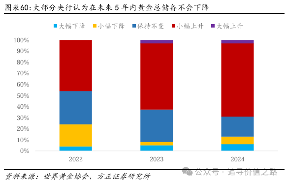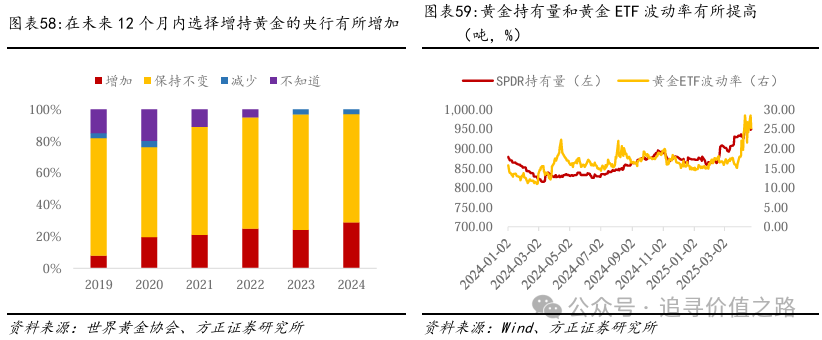 (1)短期存在回调可能第一,短期面临投资者兑现压力。根据世界黄金协会的问卷,2024年,认为可能在未来12个月能增加黄金储备的央行已达到三成左右,而认为不减少黄金储备的央行超过了97%。央行对黄金的价格相对不敏感,因此黄金价格的上涨可能会抑制央行对黄金的购买并促进央行进行战术性抛售,但央行购买量的减少幅度可能相对有限,战略性购金需求仍然强劲。而从黄金ETF的持有量和黄金ETF波动率指数来看,黄金的价格在短期可能面临黄金投资者的兑现压力。黄金的价格在短期看可能有回调的可能。