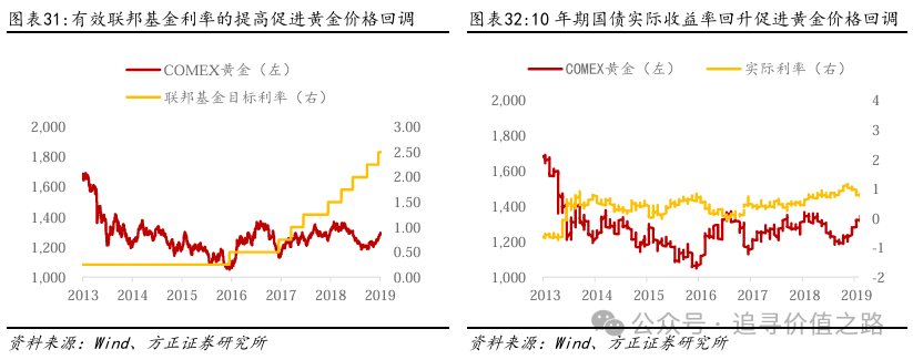 2013-2018年,美联储缩减量化宽松的计划和世界经济的复苏,促使了黄金价格的回调。2013年,美联储开展了Taper计划,逐步缩减量化宽松的规模。Taper的政策信号表示美联储对市场的支持力度下降,边际收紧的货币政策促进了黄金价格的回调,但此举提高了市场对美国金融市场的担忧,进而引起了市场的缩减恐慌(Taper Tantrum)。而此后美国经济的复苏和中国廉价工业品产能的提升,同样抑制了黄金价格的进一步上涨。