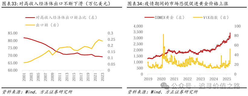 2019年至今,随着中美贸易战的逐步扩大、全球经济增速的放缓和地缘政治动荡,黄金的价格开始不断上涨。在全球化分工下,国家主要分为三类,分别为资源国、生产国和消费国,其中高收入经济体主要为商品进口的消费国。而全球商品出口金额略有复苏,但对高收入经济体的商品出口占比不断下滑,体现了全球化进程的放缓和消费国需求的疲软。而2018年开始的中美贸易战的发酵,为增速放缓的全球经济增加了新的不确定性。而后2019年的疫情更是抑制了全球经济的增长,提高了投资者对黄金的避险需求。2019年拉美多国的政局动荡也是黄金避险需求提高的一个重要因素。而在2020年,由美国国会“中国特别工作组”正式提出的“小院高墙”概念,更是凸显了美国逆全球化进程的持续推进,进而促进了黄金在国际支付中对美元的替代。
